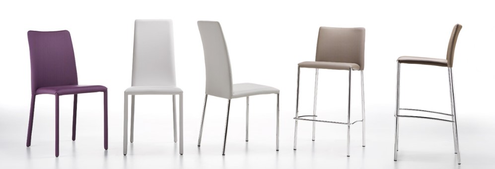 TheSILVY upholstered bar chair has a four-legged base in painted metal or chrome and a footrest. The seat upholstery gives a choice of a wide range of fabrics, leather or leatherette. On request, the chair can also be upholstered with its own fabric for a minimum order of 6 pieces. The model is stackable in 2 pieces. The chair is available in 2 sizes.