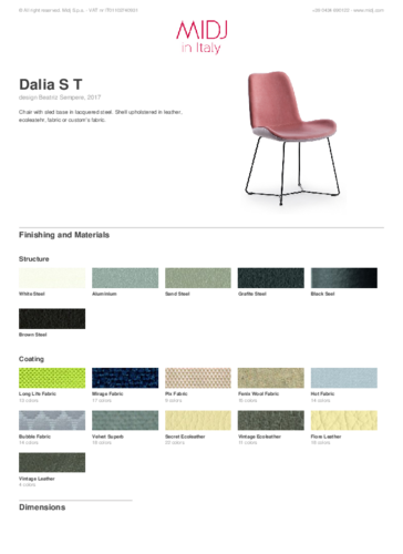 With the DALIA collection by Spanish designer Beatriz Sempere, you will appreciate its practicality above all. The design pieces are ideal for offices and work spaces. The range is made up of fully upholstered seats and a metal or wooden base. The upholstery in high-quality textile or leather can be combined in 2 colours. Please contact us for this option. Beatriz is characterised by the frivolity and non-conformity of the seventies, made modern for the needs of today.
