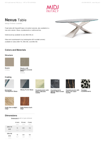 The NEXUS table collection was designed by industrial designer Andrea Lucatello for the Italian brand MIDJ. The dominant element of the collection is its massive cross base. It is made of a material called Baydur®, a highly durable, versatile and, above all, lightweight fabric. The table top is available in a choice of shapes and materials. Andrea Lucatello is known for his original approach to each design. He does not create collections, but unique specific pieces. All the objects he creates have a strong individual character and a progressive design. This original table will be especially appreciated in meeting and conference rooms, where it will become a dominant feature of the interior.