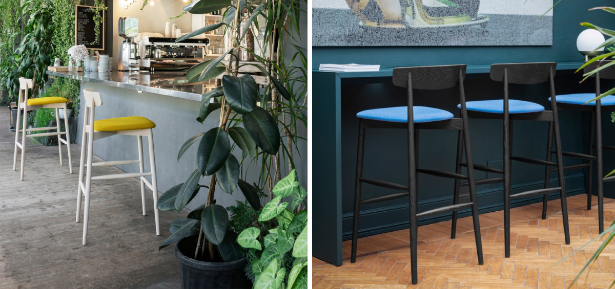 The resulting design of the Claretta bar stool was inspired by the atmosphere of Parisian bistros. Designer Florian Schmid gave it slim and neat lines. Its design is simple, but it stands out for its striking details, such as the visible connection between the turned legs and the backrest, which is slightly tilted to provide maximum comfort. The base is made of ash wood , available in several shades of stained or coloured lacquer. The wide range of upholstery offers a plethora of colourful and neutral options. The barstool is stackable up to five pieces and is also available in a classic chair version with or withoutarmrests.