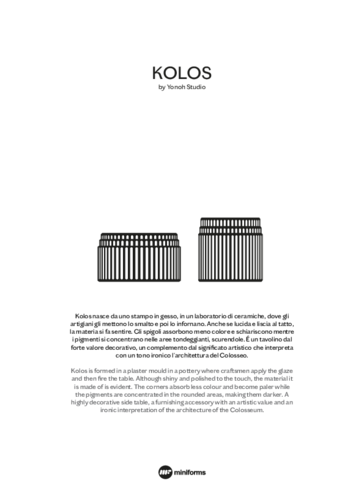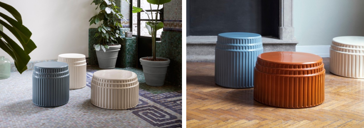 Design studio Yonoh created the Kolos coffee table as an ironic interpretation of the Colosseum. It is formed in a plaster mould in a pottery workshop, where craftsmen apply the glaze and then fire the table. Although it is polished, the material from which it is made is evident. The corners absorb less paint and are lighter, while the pigments are concentrated in the rounded areas. Colossus thus forms a highly decorative side table that combines the function of a home accessory with artistic value, and is a bit of an exhibit. You can choose from several colour variations of glazed and lacquered ceramics and two sizes.
