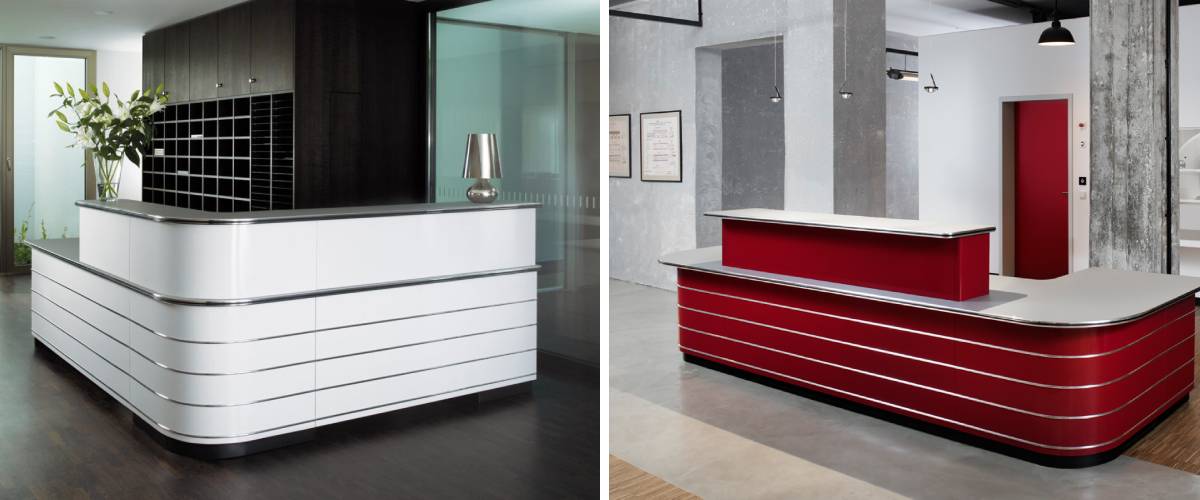 The reception desk gives your visitors and customers an elegant and fresh welcome from the first contact. This sends an important signal for your company culture. The elegant Classic Line reception desk is the perfect piece to capture your heart. Like all Müller products, it is made of 3 mm thin steel plate. The counter is available in several colours with white and dark or light grey tops. The model consists of a worktop, corner element, side panel, container, front panel (all with decorative mouldings), cable outlet and A4 metal shelf.