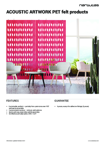 Are you looking for an element that will improve the acoustics in your office? The Acoustic Artwork panel collection offers a helping hand! The lightweight and versatile models will not only take care of the acoustic properties of the space, but will help to implement unique, creative and design solutions. Choose from three types for wall or ceiling mounting. With the Partitions, Clouds or Tile models you will achieve an exclusive interior. In addition to functionality and aesthetics, these products fulfil the sustainable vision of the Narbutas brand. They are partly made of recycled material that is suitable for further recycling after use.