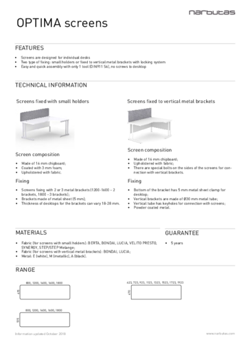 If you share an office with several colleagues and require privacy for your work, the OPTIMA desktop partition is perfect for you. The piece is made of 16mm chipboard that is covered with upholstery. The screen is designed for Narbutas desks of the OPTIMA C, OPTIMA Plus, MOTION, EASY, T-EASY, ONE, ONE H series. You can choose from eight sizes and a wide range of upholstery. The price includes 2 metal brackets to which the screen is attached.