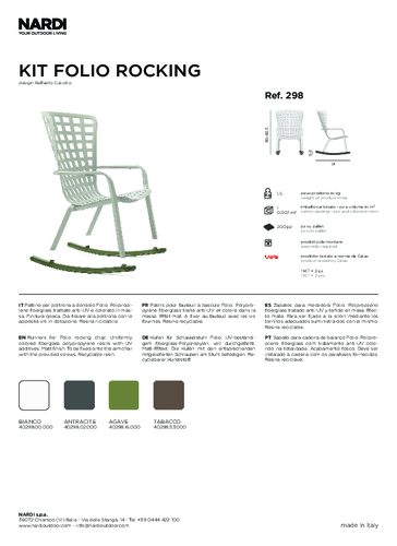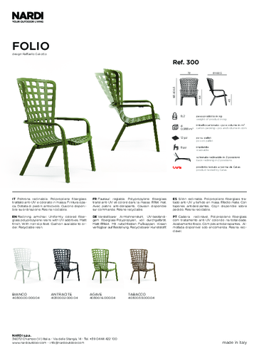 Looking for a designer and comfortable armchair made of sustainable material that you can forget about in the rain? The Folio design armchair by Nardi for outdoor use is made of polypropylene foamed with glass fibre . You can choose from four matt shades. The surface is perforated with a square pattern. The backrest, which is smoothly connected to the lowered seat, can be reclined to two comfortable positions - the controls can be found at the bottom of the armrests. The base is equipped with anti-slip end caps and a rocking model is also available, finished with slats. Stackability makes it easy to store and move the chairs. For even more comfort, we recommend this model with an upholstered finish. You can also buy the functional Folio footstool with the chair.