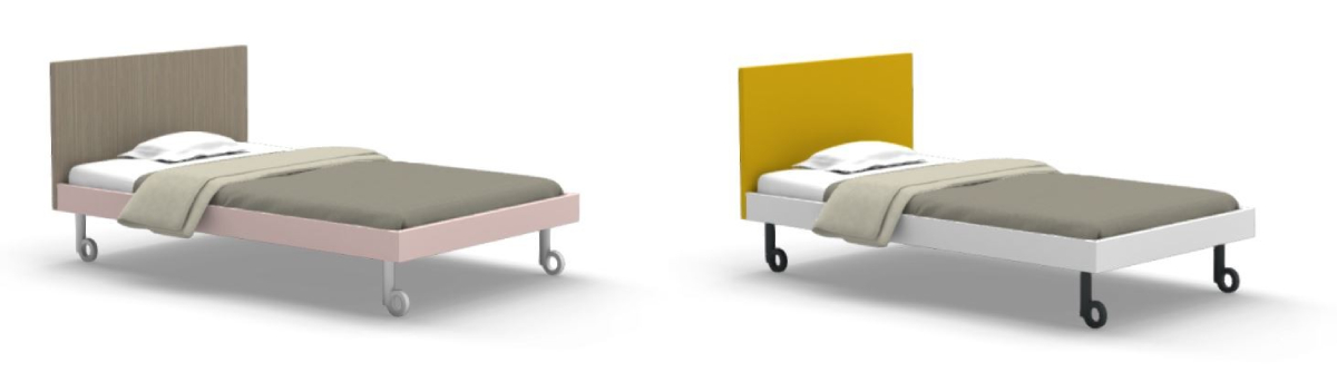 The most beautiful dreams will come true in the NUK bed . Suitable for children of all ages, it is available in several sizes and there is a wide range of natural and bright colours to choose from. The base with wheels is available in white or black. The grid and mattress are included, but the bed can be ordered without them on request. The 20 cm high orthopaedic mattress with quilting is breathable and protected by a 100% cotton cover . If desired, a heat-resistant mattress can also be supplied, or the bed can be supplied with a different frame and headboard design. Do not hesitate to contact us. You can easily match this youthful playfulness-inspired design with the rest of your room and you'll see that it won't stop entertaining. You can change it over the years. For example, the headboard cover takes this piece to the next level.