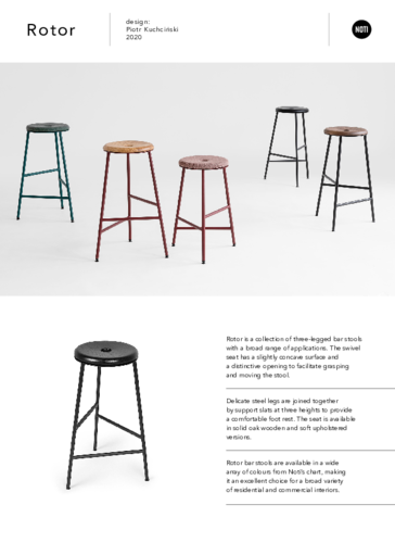 The ROTOR bar stools by designer Piotr Kuchciński impress with their original seat with a hole and delight with their versatile character. The seat is available in wood and soft upholstery. With the possibility of finishing in a wide range of colours, the Rotor model is suitable for many residential and commercial interiors. It is suitable for residential, hotel, catering and office interiors. The chairs are designed in two heights: 65 and 77 cm. The most characteristic feature of the collection is the swivel seat with a central opening for easy gripping and carrying of the chair. Its ergonomic shape with a slightly concave surface and rounded edge provides unexpected comfort. The delicate steel legs are connected by crossbars at three heights to facilitate comfortable leg support. The designer has achieved an extremely lightweight, visually similar steel base with an extremely stable and durable structure.