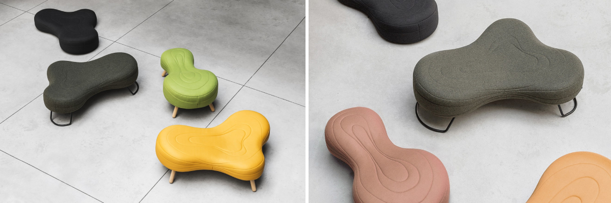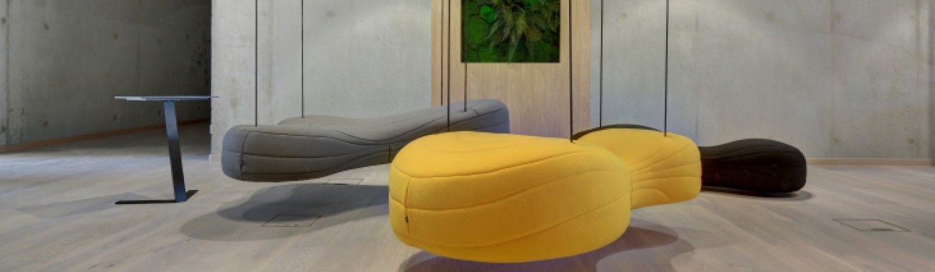The irregular shapes of the BOULI sofas create an extraordinary atmosphere in any space. The great advantage of this range is the high variability of the products. This playful design lightens the interiors of office buildings and other public spaces. The sofa is supplied with a slatted base, wooden legs and the popular variant where the sofa has only hidden glides, which gives the impression that the sofa is lying directly on the floor. Also popular are hanging systems that turn the seat into a swing. BOULI seats are available in sizes for 2 - 3 people.