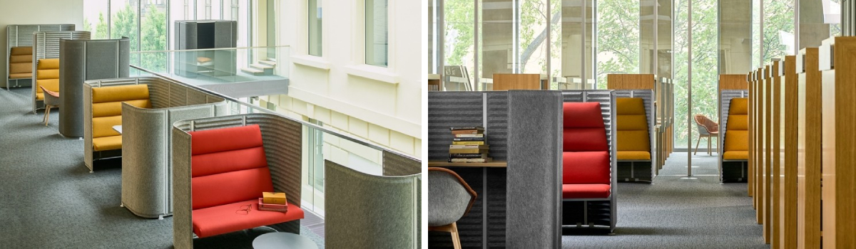 Looking for some peace and privacy for work, meetings or taking calls in open spaces such as large shared offices? The SOUNDROOM acoustic suite includes different types of seating equipped with panels, a phone booth and a meeting room. All of this is available in a wide range of shades. The acoustic panels are made of lightweight polyester felt. They always have a characteristic wavy shape on the inside and are flat on the outside. They are covered on the outside with a layer of pale or dark grey felt, so no additional upholstery is needed. No need to compromise between practicality and design!