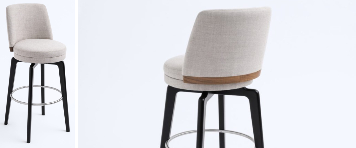 TheMACARON 125-11/1 / 125-11/1S designer bar stool is a sweet macaroon by designer Laura Silvestrini. It will become the most distinctive and original element of your modern interior. This barstool perfectly combines an imposing look, unmistakable style and at the same time craftsmanship for maximum comfort. It stands on a sturdy stable four-legged base made of wood in various shades of stains with functionally bevelled legs. A distinctive feature is the circular metal footrest. The unusually high backrest for a barstool will literally lull you into comfort. The seat and backrest are upholstered in your choice of fabric or leather. You can also add your own fabric to create a unique, bespoke look. There is also a choice of fixed or swivel seat mechanics. We recommend the MACARON bar stool especially for public spaces such as offices and commercial interiors, but feel free to place it at home.