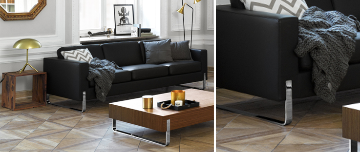 The MY TURN 30V three-seater sofa is available in a wide range of fabric or leather colours. The stable slatted base can be chosen from several shades: metallic, chrome or black. On request, we offer the option of fabrics outside the basic range or special stitching on the upholstery to create an attractive colour contrast, for example. For hard floors, we recommend selecting the felt base pad in the Accessories menu. This model is perfect for waiting rooms, reception areas or simply for relaxing in office spaces.