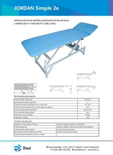 Thehigh-quality JORDAN examination couch is suitable for examination in the doctor's office as well as for physiotherapy or massage. The metal construction is available in many colours, as is the washable upholstery of the bed surface. The recliner has two segments, the head section with face opening and cover is adjustable with a gas strut. The overall height of the lounger can be adjusted thanks to an electric mechanism, to which two types of control or safety shut-off box can be added. The load capacity is 180 kg. At an additional cost, the chaise lounge can be equipped with castors, a paper towel holder, a headrest, additional folding armrests along the middle part of the chaise lounge or an extension of the storage area. Side folding bars can be ordered on request. If you have any questions, please do not hesitate to contact us.