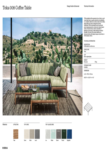 TheTEKA quality coffee table is a classic example of timeless design and proof that solid teak furniture is simply inherent in outdoor spaces. Gordon Guillaumier designed the TEKA coffee table for RODA with a tapered four-legged base and a square table top lightened by longitudinal transparencies. Unique, however, is the material of the tabletop, which is made of stoneware slabs in trendy colours and glazes according to your preference. Use the TEKA coffee table for serving refreshments, putting away a book while relaxing or perhaps just a vase of flowers. Moreover, thanks to the customisable top, you can easily match it to your space. Who wouldn't love it?