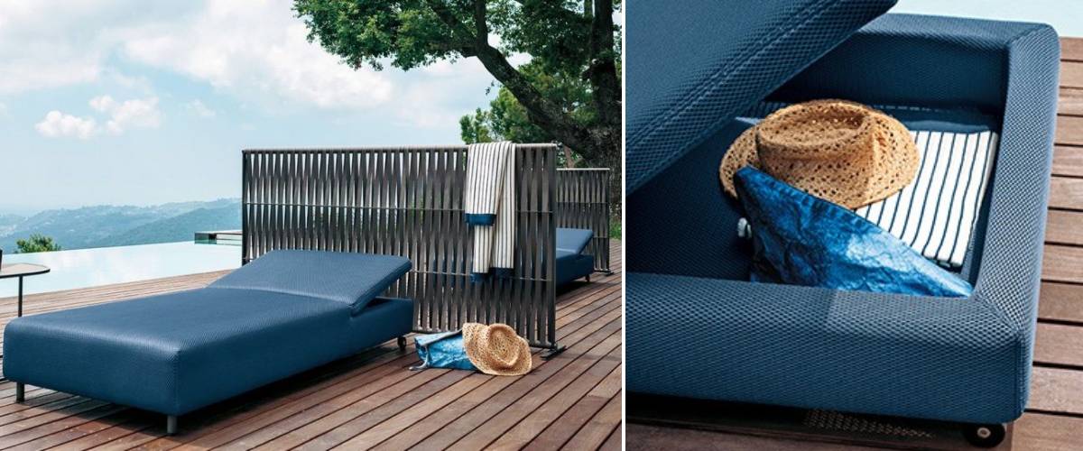 TheARENA luxury sun lounger was created so that you can enjoy the same level of comfort outdoors as you are used to indoors. The sturdy lounger features a powder-coated aluminium construction and an unobtrusive base. It has a pair of castors at the head for easy handling. The lounger is covered in a three-dimensional polyester mesh on the surface in blue, olive or grey. In the head section, the sun lounger hides a practical storage compartment for the necessities needed for summer lounging by the pool. The holiday can begin!