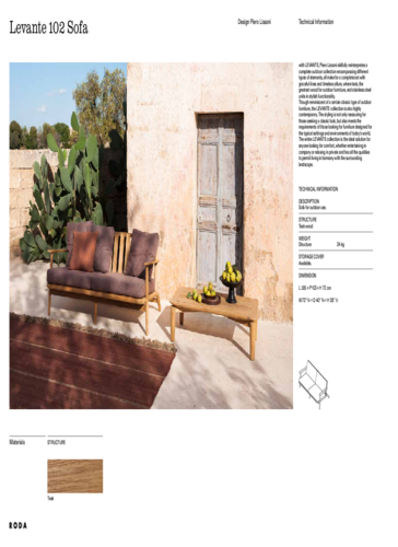 Thespacious two-seater upholstered sofa LEVANTE is further proof that comfortable furniture made of high-quality teak wood is simply inherent in outdoor spaces. Piero Lissoni designed the LEVANTE sofa for RODA with enough space for 2 people to sit side by side in comfort and unrestricted movement. The sofa has excellent stability thanks to the rear bevelled base. There are of course comfortable armrests at both ends of the sofa. The LEVANTE two-seater sofa has extra-durable upholstery in your choice of fabric or customised from your own fabric. Moreover, you can easily match the teak furniture with any other pieces, not only from RODA. You will never regret investing in timeless pieces.