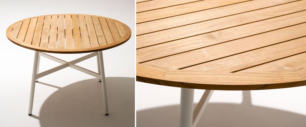 TheGAMMA designer table with teak top is the last accessory you've been missing to create a comfortable and durable garden seating area. Use it primarily for serving tasty snacks, but also as a work or storage area. The four-legged table base is very sturdy, which adds both style and excellent stability. It is made of steel in a milky or grey finish. The round table top, which is offered in 2 sizes, is made of teak crossbars in a light natural shade. Teak wood has great properties for outdoor use. GAMMA is a durable and practical table that you will love. Also check out another variant of this model with a stone top.