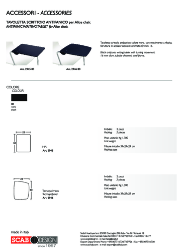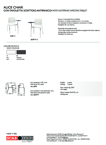 TheALICE design chair with a shell made of recyclable technopolymer from the Italian brand SCAB with a four-legged steel base in chrome will win over not only lovers of minimalist design. The seat and backrest are available in several colours according to the current colour list. This model features a folding table - available in black technopolymer or HPL. Stackability allows you to stack the chairs on top of each other, saving you space and making it easier to handle and store the chairs in the off-season. The connecting system for the bases (see accessories) also serves this purpose perfectly. The durability of these chairs is backed up by the CATAS load certificate, making them a great choice for a private kitchen as well as a bar or restaurant. You will appreciate the possibility to combine the chair with other models in the same design. The chair is supplied in a minimum of two pieces.