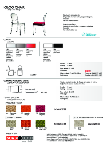 Themodern IGLOO stackable chair from Italian manufacturer SCAB with a four-legged base is made of polycarbonate, making the model a versatile piece suitable for indoor and outdoor spaces. The design of the IGLOO chairs can be described as refinement and elegance with a slight baroque touch - it gives the interior a timeless yet traditional atmosphere. You can choose from several colours, including transparent variants. The durability of these chairs is backed up by the CATAS stress certificate, so they are a great choice not only for home interior designers. The chairs make a great addition to tables at social events and are perfect for designer cafes and restaurants. Handling the chairs is made easier by the optional transport trolley. You will appreciate the possibility to combine the chair with other models in the same design. For even greater comfort, we also recommend this model with armrests.