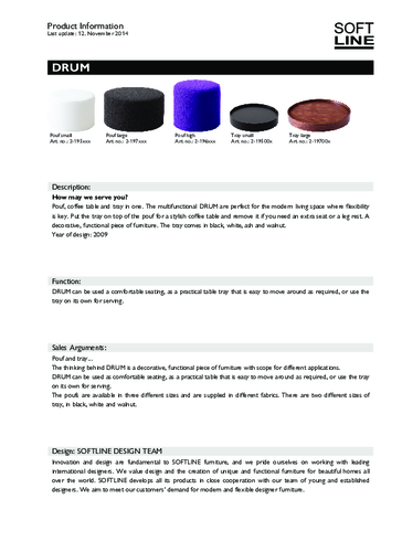 Create your own original compositions from Drum poufs and tables in different sizes and colours! You will thus get novel seating that can always be flexibly adapted to the number of visitors at the time. The ideal product for a modern lifestyle where flexibility is key. The extra large pouf is upholstered and can be ordered in several different sizes. It is available in a wide range of types and colours, including the option of custom material supplied by the customer, so you can perfectly adapt it to the colour requirements of your specific interior. There are no limits to your imagination. The interior of the upholstered parts can be treated with a fire-resistant finish at an additional cost.