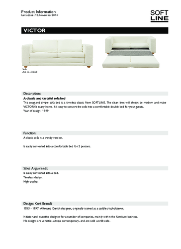 The multi-purpose Victor sofa bed is the work of Danish designer Kurt Brandt and features classic clean lines that never go out of style. An elegant seating area for resting and relaxing during the day can easily be transformed into a comfortable 140 x 220 cm double bed for yourself or guests. The upholstery can be selected from a wide range of fabrics and if you wish, your own material can be supplied (consumption is 10.9 m²). The cover is removable and can be dry cleaned. On request, the interior of the upholstered parts can be treated to increase fire resistance at an additional cost. The base is made of high-quality solid beech wood in a natural finish. This piece in a simple design will stand out in both domestic and commercial interiors and will help to solve problems of lack of space.