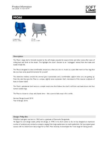 Danish designer Philip Bro was inspired by the famous sculptures of the Easter Islands to create the Moai sofa, which the piece resembles in profile and name. The high, rounded shell adds privacy and was also originally inspired by the shape of pebbles on the seashore, perfectly smoothed by the never-ending work and power of the sea waves. This unique piece has earned the Good Design Award 2017 and the German Design Award 2018. The steel construction is available in black or white lacquer, or solid ash wood in natural or black lacquered finish. The sofa is fully upholstered. The range of upholstery colours and materials is very wide, including the option of supplying your own fabric. The practical removable cover can be dry-cleaned. The collection also offers a swivel or four-legged chair. On request, this model can be equipped with a special treatment of the interior materials to increase fire resistance. So treat your home or business to a piece that will become an unmissable landmark and bring style to your interior!