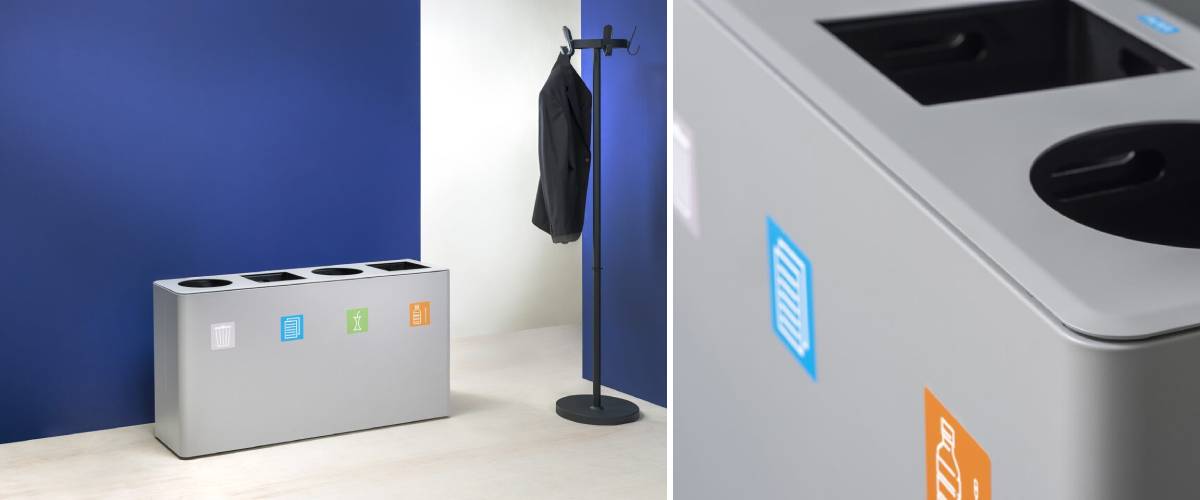 Thestylish DUNK 4 waste bin is a playful helper for convenient waste sorting. This handy bin has a modern, rounded body made of durable plastic in a sleek grey design. A total of 4 separate compartments hold containers for mixed waste, paper, organic waste and plastic. You will appreciate the distinctive coloured stickers to distinguish the waste, which are included in the price of the bin. Take a responsible approach to ecology and get a DUNK 4 bin for your home or office. You'll find that recycling will be so much easier with a nice bin like this!