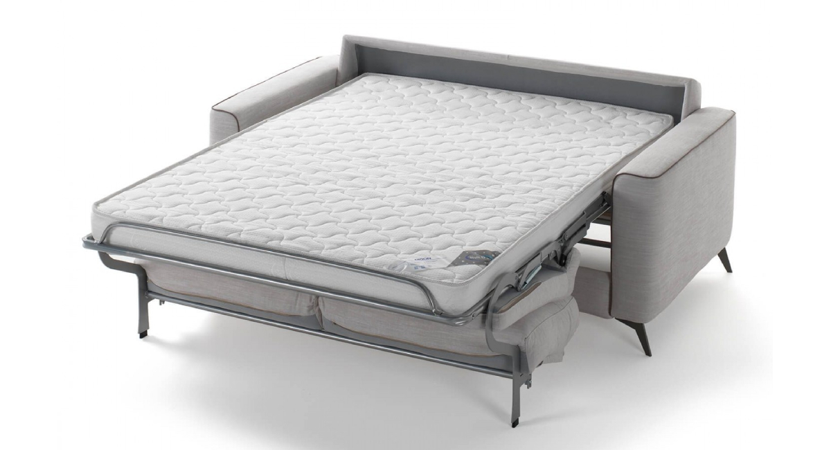 The sofa is equipped with the innovative Otello Big H12 SPL folding mechanism. This is a folding mechanism that can be used to open the sofa in one movement, while leaving the seat and back cushions in place. The pull-out mechanism has a standard electrically welded base with elasticated seat belts and an optional grid. A slatted grate can be selected at an additional cost to further stabilize the bed. In the demonstration video you can see how easy it is to unfold.