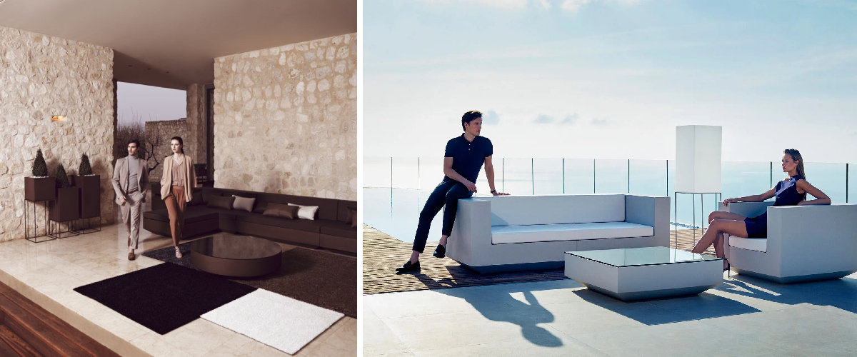The extensive VELA outdoor furniture collection offers quality, comfort and design similar to indoor furniture. Models and decorations from this collection can be freely combined and integrated into any environment. The minimalist models are equipped with a base that makes some objects appear to float above the ground.