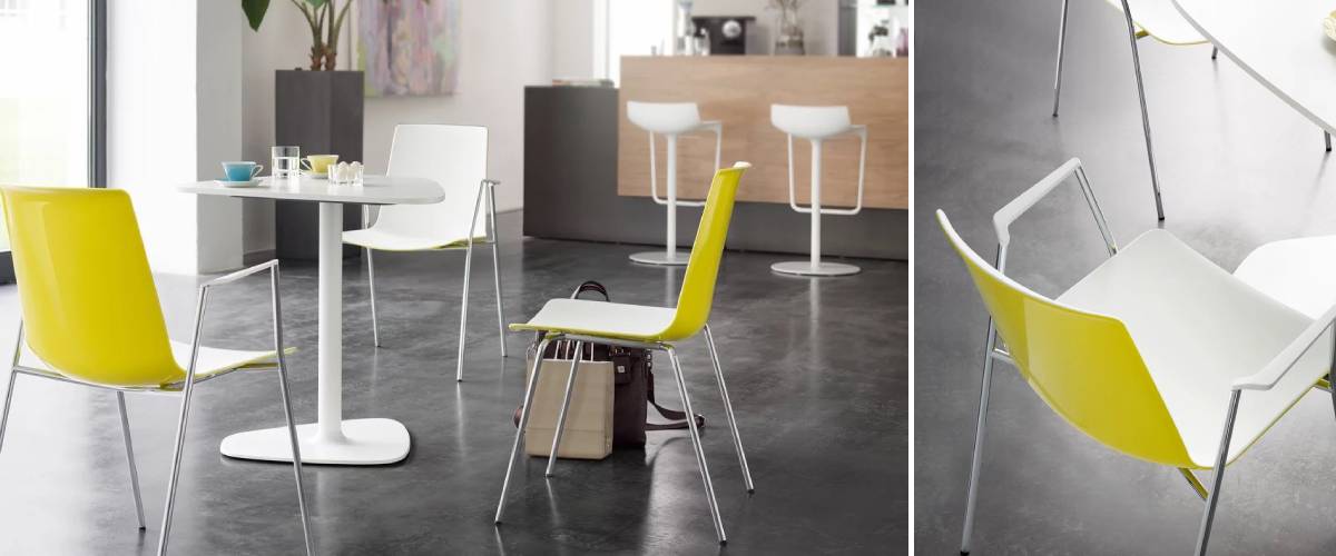 Theplayful plastic conference chair NOOI 6601 is a cheerful and practical accessory that makes it easy to create a seating area in no time. With this creatively conceived chair, which you can modify as you wish, your tasks will be a breeze. The chair stands on a base with a bevelled pair of rear legs, which you can choose in your choice of painted metal or chrome. The outside of the chair is available in vibrant, on-trend colours. The details are available in white, black or anthracite. The armrest covers are always the same colour as the chair's plastic glides. The playful NOOI 6601 plastic conference chair brings guaranteed seating pleasure!