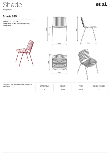 Stohovatelná židle SHADE je přesně tím posezením, které je jako stvořené pro moderní interiéry. Jednoduchý design, kvalitní materiály a hravé barevné provedení – to jsou zbraně, kterými židle SHADE bojuje za stylovější soukromé, ale i veřejné interiéry a exteriéry. Židli navrhl francouzský designér Philippe Nigro a při tvorbě se zaměřil zejména na vlastnosti jako je funkčnost, optická vzdušnost a také jemná elegance. Výsledkem je originální, komfortní celokovová židle, která byla vytvořena technikou svařování ocelového drátu, což jí dodává čistou a minimalistickou siluetou. Oživte židlí SHADE interiéry moderních jídelen, kaváren, restaurací či zahrad – získáte jedinečný zážitek a výjimečné pohodlí.