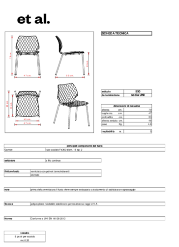 Hlavní parketou italské nábytkářské značky Et al. je zejména posezení do veřejných prostor. Jejich produkty v sobě snoubí moderní, vizuálně atraktivní design a vsází výhradně na materiály prémiové kvality. Kolekce židlí UNI je těmto myšlenkám zcela věrná a jistě si vás získá svou originalitou a komfortem. Mezi židlemi této série najdete i díky škále barvených provedení ty pravé pro svou stylovou kavárnu, restauraci i firmu.