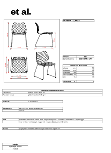 Hlavní parketou italské nábytkářské značky Et al. je zejména posezení do veřejných prostor. Jejich produkty v sobě snoubí moderní, vizuálně atraktivní design a vsází výhradně na materiály prémiové kvality. Kolekce židlí UNI je těmto myšlenkám zcela věrná a jistě si vás získá svou originalitou a komfortem. Mezi židlemi této série najdete i díky škále barvených provedení ty pravé pro svou stylovou kavárnu, restauraci i firmu.