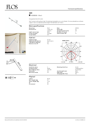 Nástěnné svítidlo 265 od designéra Paola Rizzatta vyniká jednoduchým tvarem a silným charakterem. Disponuje praktickým nastavitelným ramenem a reflektorem z lakované oceli, který poskytuje přímé světlo. Podpěra reflektoru je z chromované mosazi a celkový tvar vyvažuje litinové kuželové protizávaží. Lampa je dostupná v černé, bílé a více barevné variantě a perfektně doplní pracovnu, ložnici i obývák, aniž by zabírala místo. V případě jakýchkoli dotazů nás neváhejte kontaktovat.