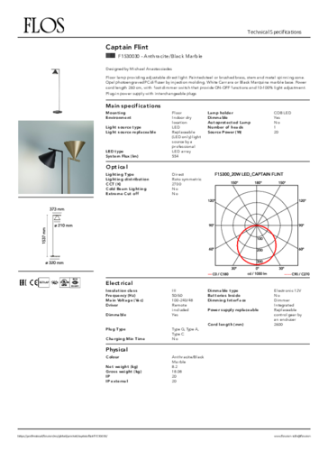 Stojací lampu CAPTAIN FLINT poskytující nastavitelné přímé světlo navrhl designér Michael Anastassiades. Svítidlo je k dispozici v černě lakované oceli nebo kartáčované mosazi. Stínidlo lze otáčet a nařídit tak tok světla podle potřeby. Podstavec je vyroben z bílého carrarského /pro masaznou variantu) nebo černého markýzového mramoru (pro černou variantu). Opálový difuzor je tvořen polykarbonátem s fotogravírováním pomocí vstřikování. Na napájecím kabelu dlouhém 2,6 m naleznete vypínač ON/OFF a stmívač pro nastavení jasu. Napájecí zdroj má vyměnitelné zástrčky. Nabízíme také venkovní variantu. V případě jakýchkoli dotazů nás neváhejte kontaktovat.
