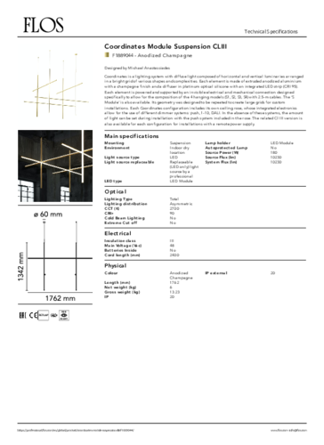 Minimalistické, ale zároveň velice výrazné závěsné svítidlo COORDINATES poskytující rozptýlené světlo navrhl designér Michael Anastassiades. Je složené z horizontálních a vertikálních tyčí uspořádaných do jasné mřížky různých tvarů a složitostí. Lišty jsou vyrobené z extrudovaného eloxovaného hliníku s povrchovou úpravou v barvě šampaňského nebo stříbřitou argent a z difuzoru z platinového optického silikonu s integrovaným LED páskem. Každý prvek je napájen neviditelným elektrickým a mechanickým připojením navrženým speciálně tak, aby umožňovalo složení stropních modelů z kolekce. Svítidlo se dodává s vlastní růžicí, jejíž integrovaná elektronika umožňuje použití různých systémů stmívání. Celá kolekce COORDINATES nabízí závěsné, stropní i nástěnné osvětlení, které se postará o nezapomenutelnou atmosféru za každých okolností. V případě jakýchkoli dotazů nás neváhejte kontaktovat.