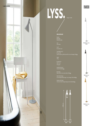 Dánská firma Frandsen si při navrhování svítidel vždy hrála s geometrií. Design řady LYSS není výjimkou. Tuto kolekci vymyslela designérka Tonia Rie a kladla přitom důraz na to, aby světla působila harmonicky. Kolekce LYSS obsahuje svítidla odvážných tvarů avšak jejich tlumené barvy z nich dělají ideální doplňky do moderních bytů městské džungle i do domů ve venkovském stylu.