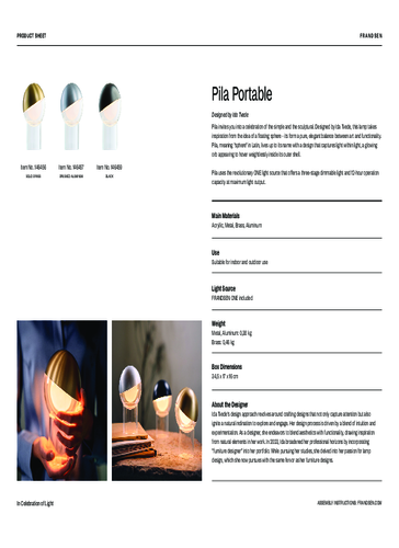 Stolní lampa PILA, kterou navrhla designérka Ida Tvede, je inspirována myšlenou vznášející se koule. Hraničí na pomezí umění a funkčnosti a přináší nastavitelné světlo pro různé příležitosti. Díky tomu, že je přenosná, můžete ji umístit na noční stolek, komodu či do pracovny. Intenzitu světla lze regulovat od náladového až po živé osvětlení. PILA využívá revoluční světelný zdroj ONE, který nabízí třístupňové stmívání světla a 12hodinovou provozní kapacitu při maximálním světelném výkonu. Je dostupná ve třech barevných variantách a lze k ní dokoupit magnetický zdroj dobíjený přes USB kabel. Hledáte-li harmonické a funkční osvětlení pro různé příležitosti, PILA se vám trefí do noty.