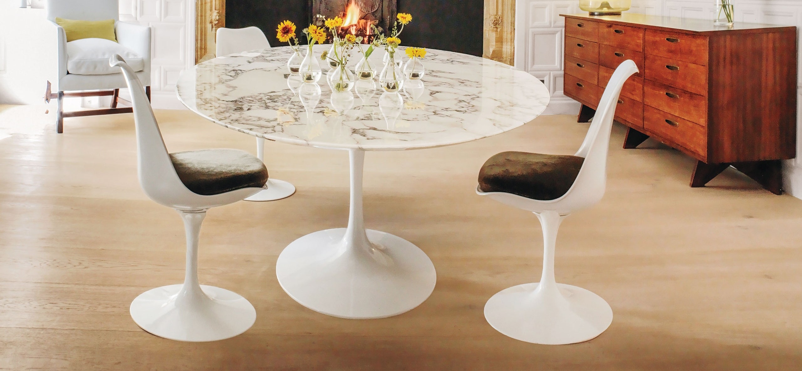 Stůl s hladkými liniemi modernismu, jehož první návrhy vznikly v dílně Eera Saarinena v roce 1955 společně se židlí ve stejném stylu, se už ve své době stal klasikou průmyslové doby. Můžou za to i použité experimetnální materiály, které ze stolu udělaly originální kus nábytku. Stolová deska kulatého tvaru se vyrábí v bílého lamina nebo z mramoru. Centrální podnož ve futuristickém designu je hliníková s lakovanou úpravou v černé nebo v bílé barvě. Na výběr několik velikosti stolové desky.