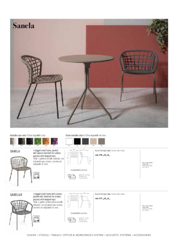 SANELA je moderní kolekce sedadel upletených z pevných polyesterových lanek s teflonovou úpravou, díky které jsou ideální pro venkovní použití. Lanka jsou také odolná proti skvrnám, odpuzují vodu a olej. Kolekci SANELA s minimalistickým vzhledem je ideální doplnit barevnými polštáři či přehozy a umístit ji do interiéru, na terasu, zahradu nebo na zahrádku restaurace - představivosti se meze nekladou.