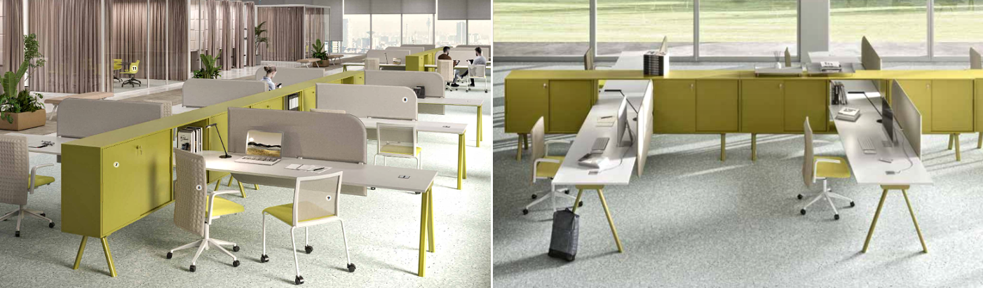 Kanceláře typu open space neustále získávají na popularitě a jedním z důvodem je, že šetří místo. Kolekce kancelářského nábytku WORKSTATION a 2027 přesně toto splňuje. Finální podobu si můžete plně přizpůsobit vašim prostorům. Kromě barevného provedení si můžete zvolit také konkrétní sestavu - některé obsahují jen stolek a skříňku, jinde najdete i lavičku a jiné jsou určené pro dva pracovníky. Všechny skříně stojí na podnoži, takže se pod nimi velmi snadno uklízí, což je vlastnost, kterou zajisté oceníte. Stoly mohou být být vybaveny vysoce výkonnými zvukově absorbujícími panely, které zlepšují soukromí a celkovou akustiku pracoviště.