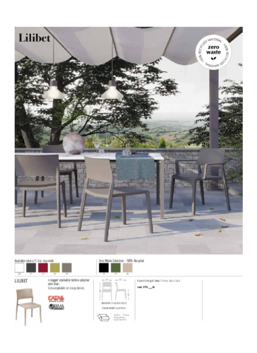 Hravé, nejen zahradní židle LILIBET s podpěrkami pod ruce si na první pohled zamilujete. Se svým jednoduchým vzhledem se stanou králem všech zahradních oslav, vyniknou na každé terase a budou vkusným, ale jednoduchým doplňkem v restaurací nebo barů. Jsou vyrobeny z vysoce odolného plastového materiálu technopolymeru, který vydrží všechny povětrnostní podmínky - od sněhu až po přímý žár slunce. Na výběr je široká paleta barev, pro detail se podívejte do našeho konfigurátoru. Materiál, který byl použit na výrobu židlí je 100% recyklovatelný a barvy 25 Olive Green, 10 Black, 54 Sand jsou dokonce plně recyklované.