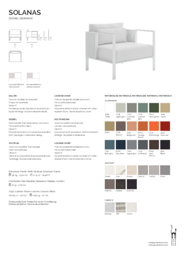 Pohodlnost nade vše. Z lounge křesla SOLANAS se vám nebude chtít zvedat. Konstrukce křesla je vyrobena z termo lakovaných svařovaných hliníkových profilů a područky jsou doplněny materiálem Dekton. Podsedák a opěrák z polyuretanové pěny je pokrytý voděodolnou tkaninou, takže si do křesla můžete v klidu sednout i poté, co jste se zrovna vykoupali v bazénu. Ke kousku si můžete dokoupit ochranný potah, díky kterému vám bude kousek dělat společníka po mnoho dlouhých let. V ceně není zahrnut polštářek, pokud si chcete užít co největší pohodlí, doporučujeme vám ho ke křeslu pořídit.