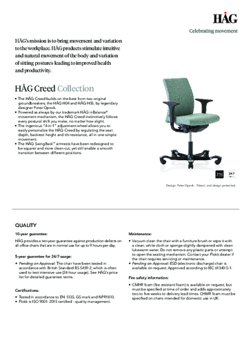 Spojením dvou průkopnických modelů norské značky HÅG vznikla kolekce CREED, která v sobě spojuje to klasický design, inovativní prvky a maximální funkčnost. Pochází z tvorby legendárního designéra jménem Peter Opsvik. Všechny modely jsou vybaveny unikátním mechanismem středového náklonu - HÅG inBalance®.