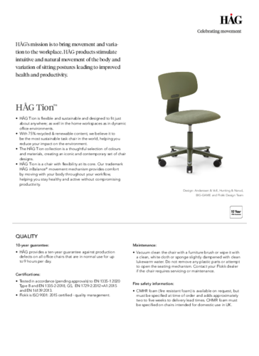 Lehký, pevný a jedinečný design kolekce TION navrhlo Studio Anderssen & Voll. Perfektně doplní domácí pracovnu i stůl v moderním open space. Židle jsou vyrobeny z 75 % recyklovatelných a obnovitelných materiálů a může se pyšnit nejnižší uhlíkovou stopou z celého portfolia norské značky HÅG, která se již přes 60 let zabývá vývojem inovativních a ergonomických židlí pro zdravé sezení. Bonusem je navíc špičkový skandinávský design. Mezi estetikou a funkčností není třeba dělat kompromisy!
