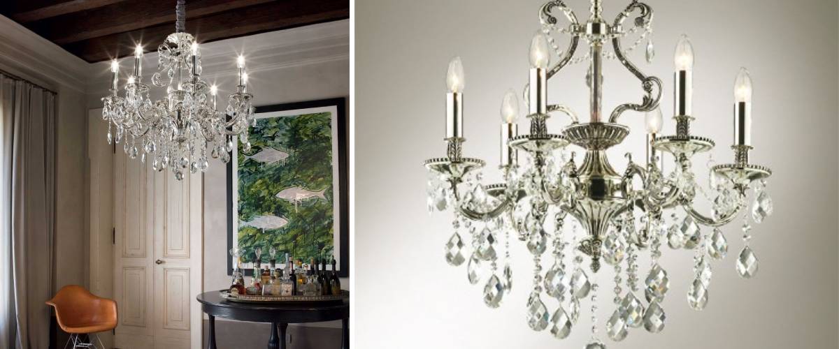 Stylová závěsná lampa GIOCONDA je ukázkou vysokého umění a prvotřídních materiálů. Tento mimořádný okázalý lustr má robustní rám a ramena z litého kovu s dekorativními rytinami, který je na výběr v provedení stříbrná nebo zlatá. Závěsné ozdoby ve tvaru kruhu nebo osmiúhelníků v různých velikostech jsou zhotoveny z transparentních krystalů. Žárovky napodobující svým tvarem klasické svíce jsou v počtu dle vámi zvolené velikosti ze 3 typů tohoto modelu. Závěsný řetěz je efektně pokryt řaseným sametem. Lustr GIOCONDA doporučujeme do stylových domácností, kaváren, restaurací nebo hotelů, kde jej sladíte se zbytkem vybavení.