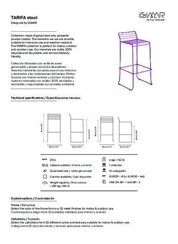 Barová židle TARIFA se vyznačuje čistými a uhlazenými křivkami, díky nimž vyšperkuje každý prostor. Skrze svůj přírodou inspirovaný design vzdává hold celé středomořské oblasti, z níž také pramenila inspirace pro celou kolekci. Její konstrukce je vyrobena z pozinkované oceli stříkané komaxitem, která zajišťuje vysokou odolnost i praktičnost. Židle je navíc stohovatelná a vhodná pro venkovní použití. Nasajte atmosféru Středomoří s barovkou TARIFA.