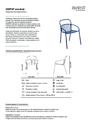 Kolekce CESTAT vyniká sofistikovanými liniemi, které vnesou eleganci do různých typů prostor. Skládá se z židle s područkami i bez nich a jídelního stolu. Najde tedy uplatnění jak na soukromé terase, tak na zahrádce restaurace nebo hotelu. Jak je u španělské značky ISIMAR zvykem, použité materiály jsou velmi kvalitní, šetrné k životnímu prostředí a 100% recyklované i recyklovatelné.