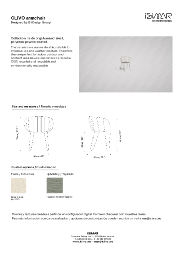 Kolekce OLIVO je inspirována ikonickými olivovníky, které zdobí celé středomořské pobřeží. Jsou klíčovým elementem zdejší krajiny i kultury. Díky tomu je design této kolekce skutečně odlišný a inovativní. Jak je u španělské značky ISIMAR zvykem, použité materiály jsou velmi kvalitní, šetrné k životnímu prostředí a 100% recyklované i recyklovatelné.