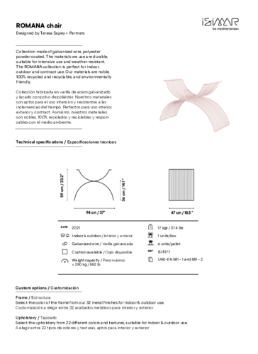 Neotřelé tvary židlí a stolu ROMANA byly inspirovány římským trikliniem, tradiční místností s lavicemi pro přijímání hostů. Vznikla ve spolupráci s designérkou studiem Teresa Sapey + Partners. Tyto kousky propojující rukopis ateliéru a značky ISIMAR se stanou dominantou vnitřních i venkovních prostor jak v soukromém, tak veřejném sektoru. Použité materiály se vyznačují odolností i šetrností k životnímu prostředí, jelikož jsou 100% recyklované i recyklovatelné.