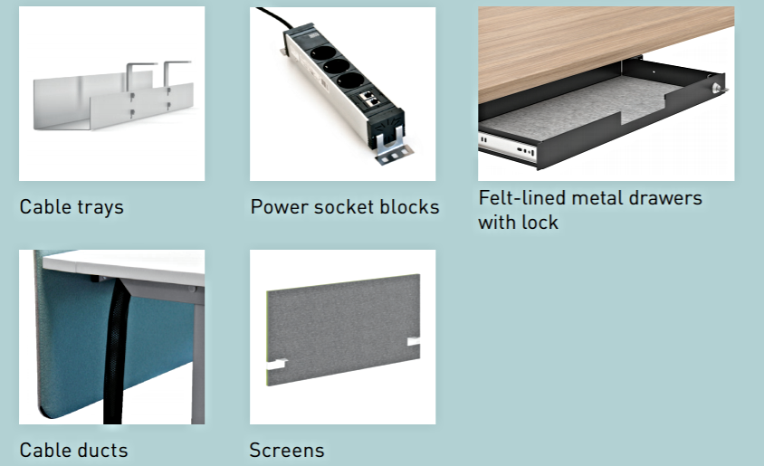 Stůl si můžete přizpůsobit přesně vašim představám. Ke kousku je možné dokoupit třeba zásuvku, akustické stěny, kabelový kanál, kovový šuplík a další skvělé doplňky.
